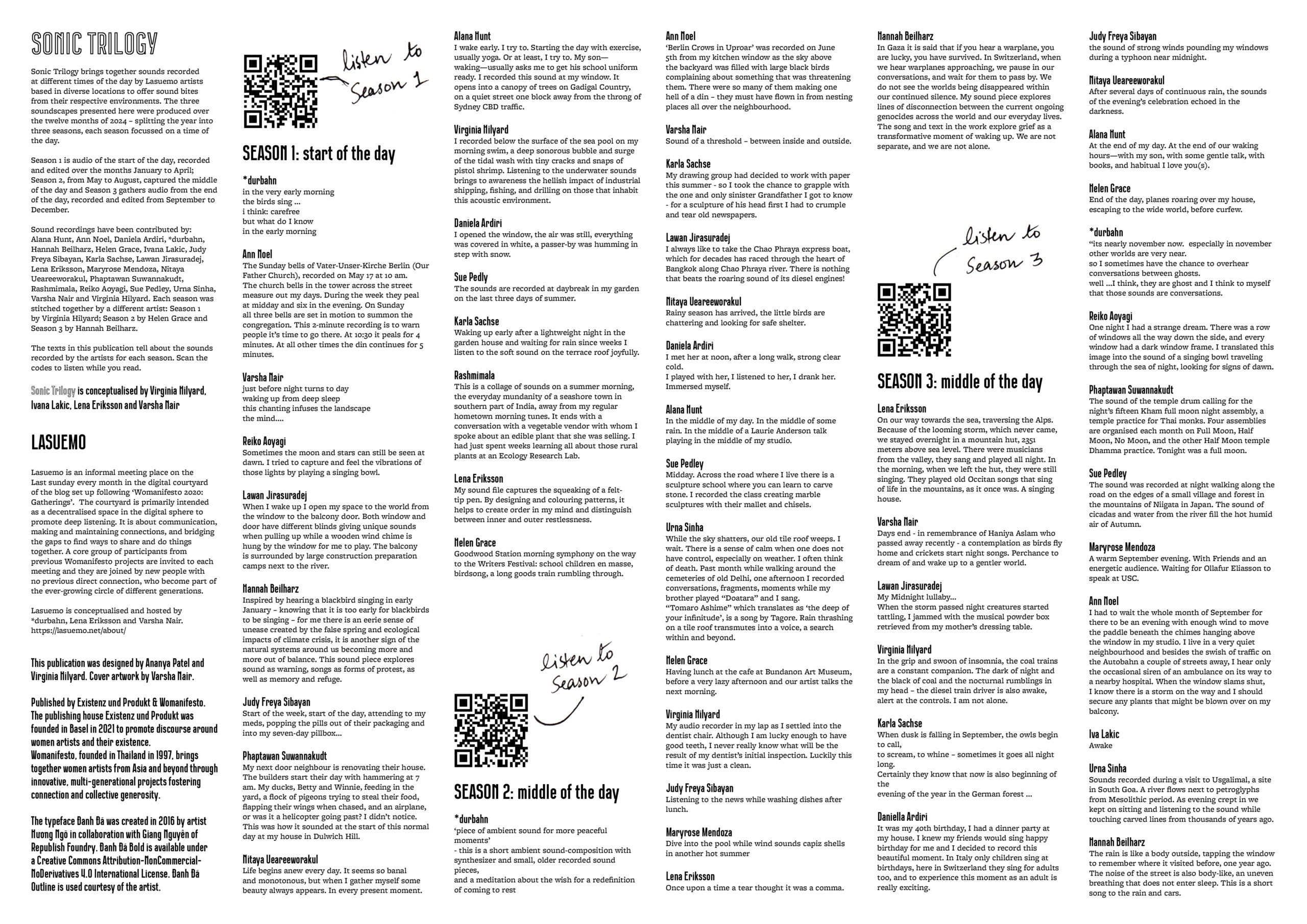 Sound recordings have been contributed by: Alana Hunt, Ann Noel, Daniela Ardiri, *durbahn, Hannah Beilharz, Helen Grace, Ivana Lakic, Judy Freya Sibayan, Karla Sachse, Lawan Jirasuradej, Lena Eriksson, Maryrose Mendoza, Nitaya Ueareeworakul, Phaptawan Suwannakudt, Rashmimala, Reiko Aoyagi, Sue Pedley, Urna Sinha, Varsha Nair and Virginia Hilyard. Each season was stitched together by a different artist: Season 1 by Virginia Hilyard; Season 2 by Helen Grace and Season 3 by Hannah Beilharz.